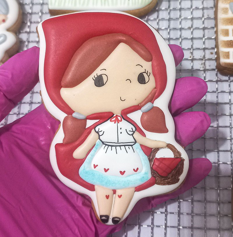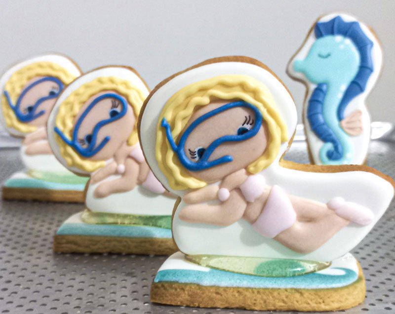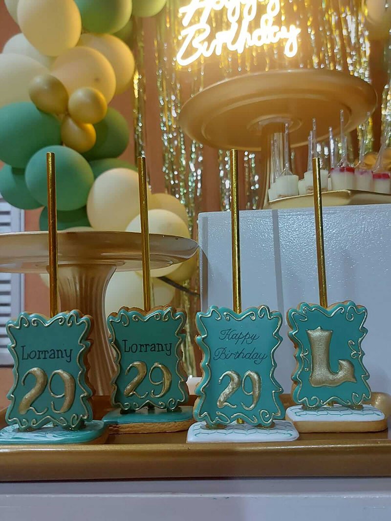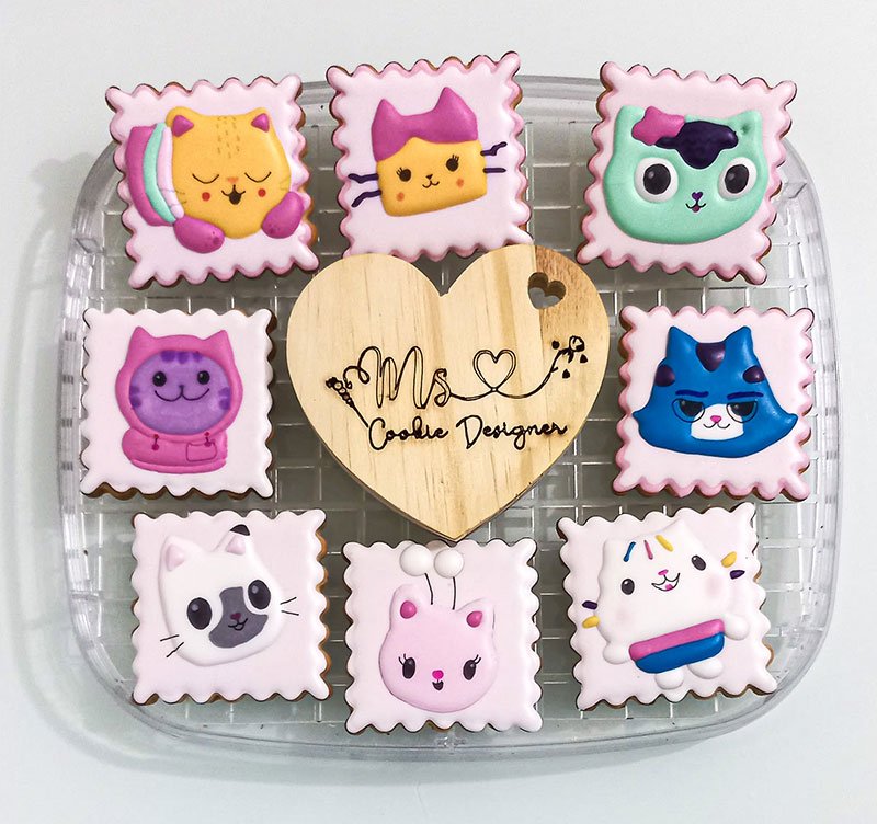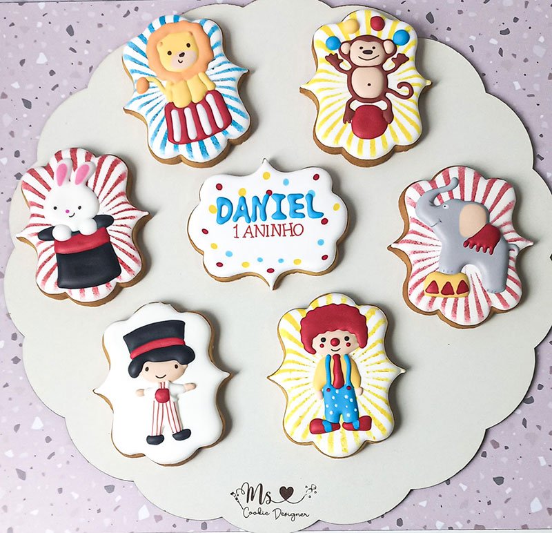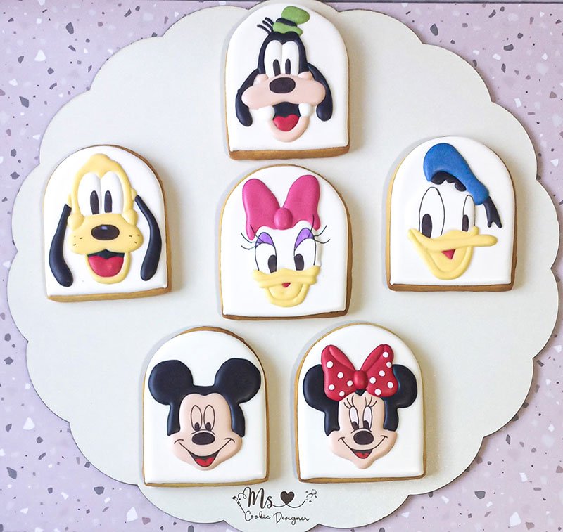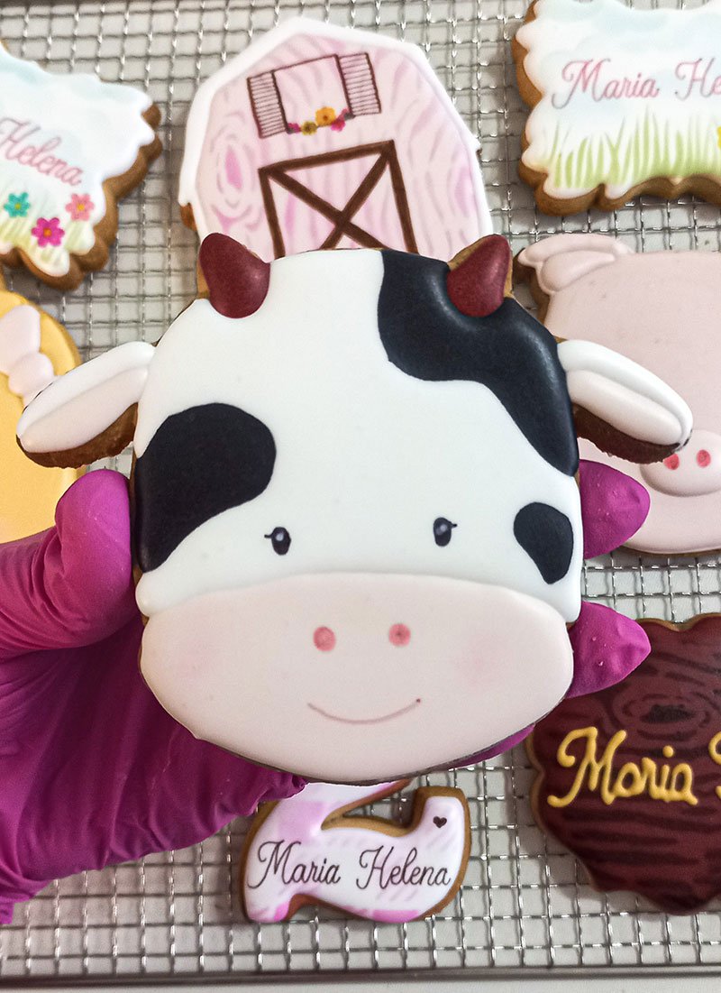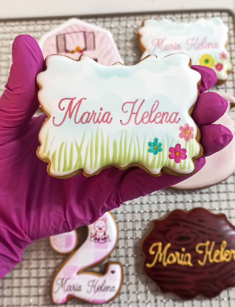 Biscoitos com designs complexos, incluindo mais de 3 camadas de decoração, personagens ricos em detalhes, acabamentos pintados à mão, efeitos com aerógrafo e toques finais com canetas decorativas e blush para realce.