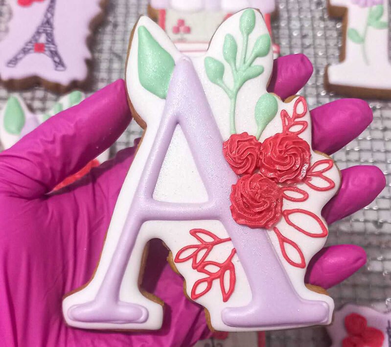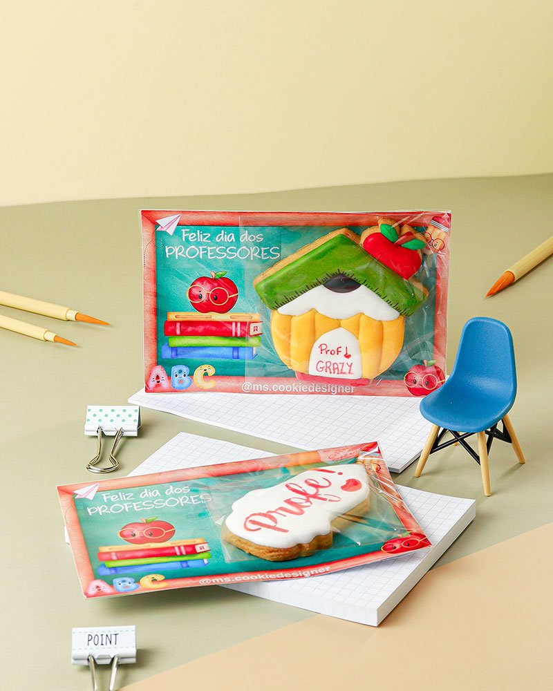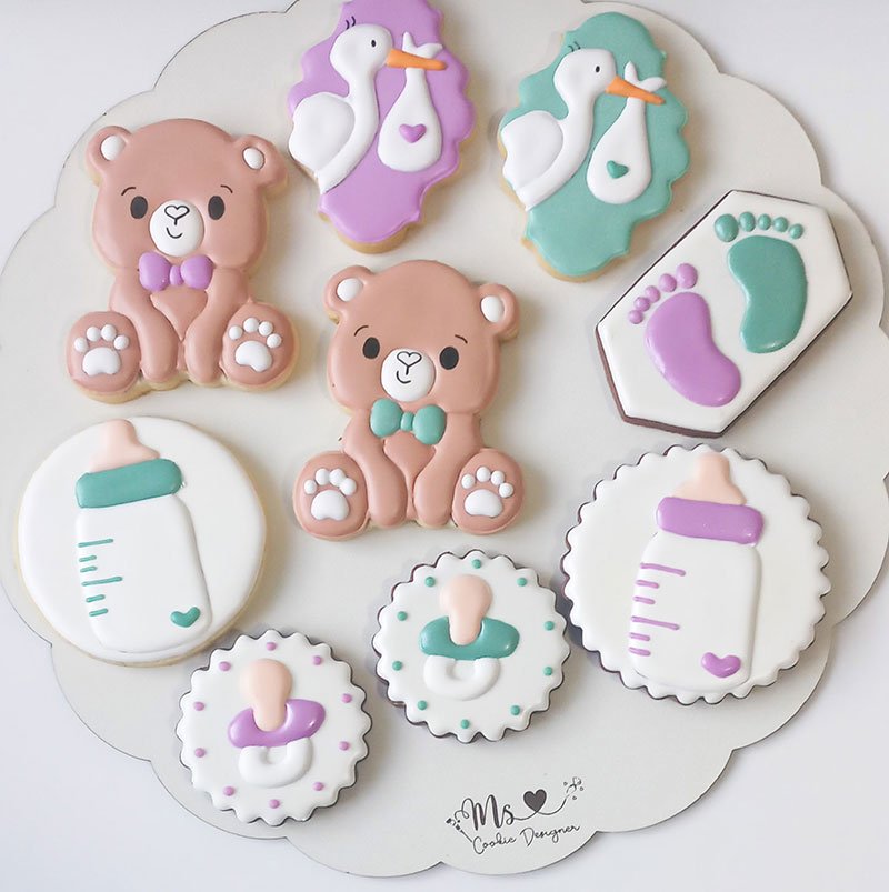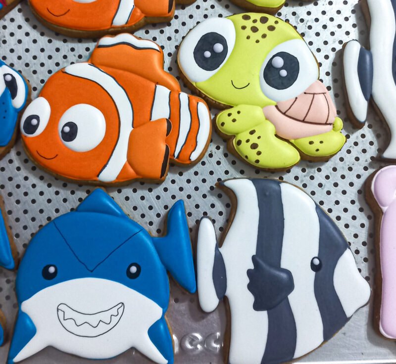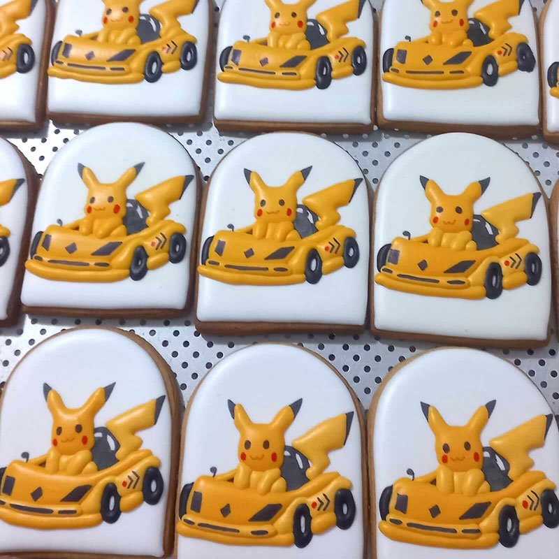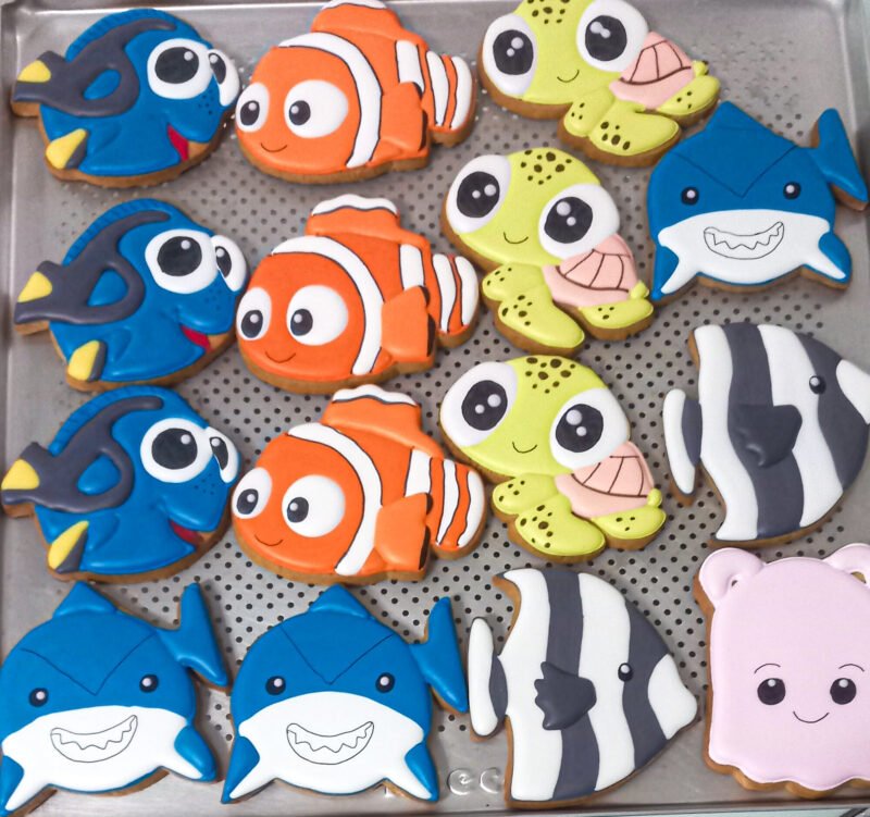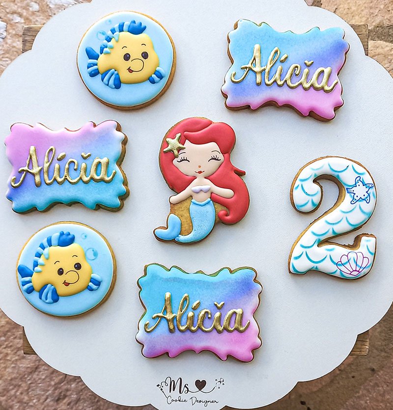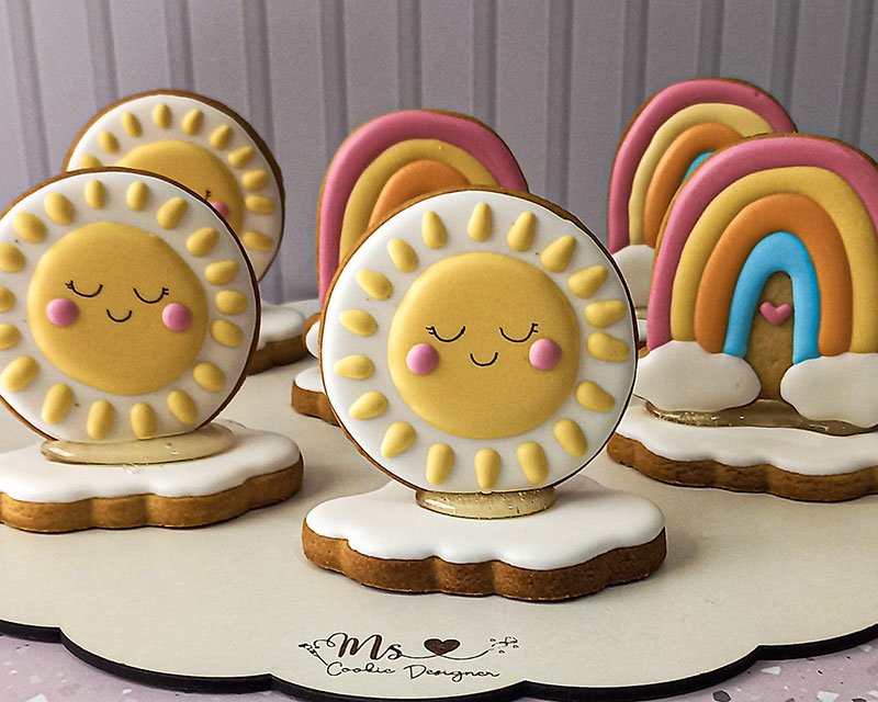 Biscoitos com designs complexos, incluindo mais de 3 camadas de decoração, personagens ricos em detalhes, acabamentos pintados à mão, efeitos com aerógrafo e toques finais com canetas decorativas e blush para realce.